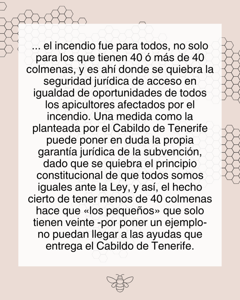 Les recomendamos la lectura AQUÍ del artículo que publicó Antonio Quesada en apigranca.es, donde explica de una forma coherente, cómo las ayudas del Cabildo de Tenerife para los apicultores afectados por el incendio de los municipios de Arafo, Candelaria, El Rosario, Güímar, El Sauzal, La Matanza, La Orotava, La Victoria, Los Realejos, Santa Úrsula y Tacoronte, solo benefician a un 16,2% de los apicultores.